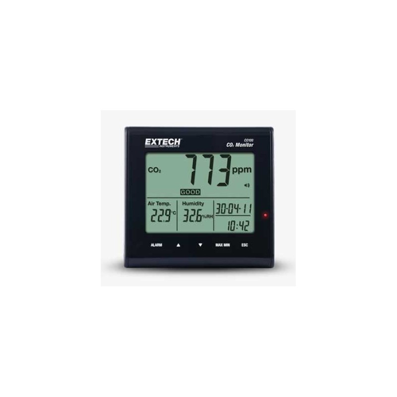 L’Extech CO100 est un appareil de bureau qui surveille la teneur en CO2 de l’air intérieur en mesurant les concentrations de dioxyde de carbone (CO2) de 0 à 9 999 ppm, la température de l’air de -5 °C à 50 °C (23 °F à 122 °F) et l’humidité de 0,1 à 90 % HR. Il est livré avec une alarme de CO2 visible et sonore programmable par l’utilisateur. L’appareil de mesure est doté d’une fonction de rappel de la valeur de CO2 maximum/minimum. Le CO100 est équipé d’un capteur de CO2 NDIR (infrarouge non dispersif) sans entretien et d’un adaptateur secteur universel.