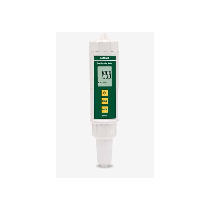 The Extech VB400 Pen Vibration Meter is designed to provide easy and accurate velocity and acceleration measurements on industrial machinery. Its measures RMS Acceleration and Velocity with metric and imperial units of measure. The VB400 has a wide frequency range from 10 Hz to 1 kHz and basic accuracy of ± (5% + 2 digits). Additional features include zero adjustment, data hold, and a low battery indicator. Water and dust resistant to IP65. Complete with test pin tip, magnetic base, 4 AAA batteries, and pouch case.